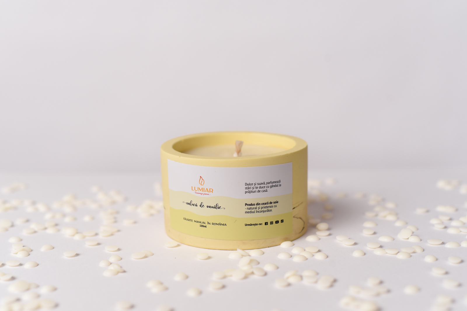 „Valuri de vanilie” este o lumânare artizanală creată integral manual – de la turnarea recipientului până la ultimele finisaje care definesc un produs cu suflet.
